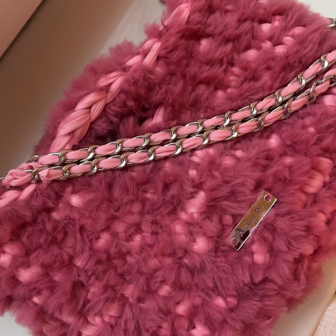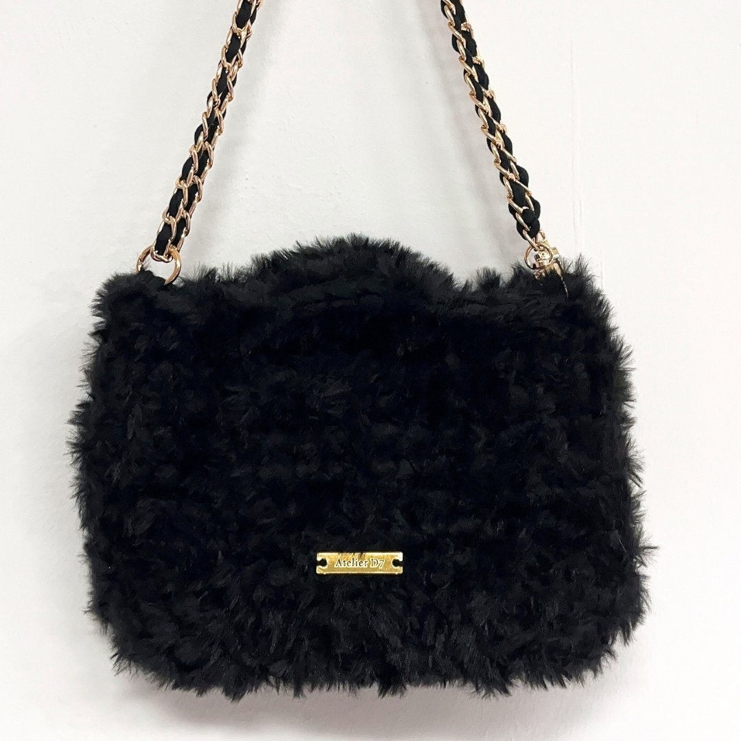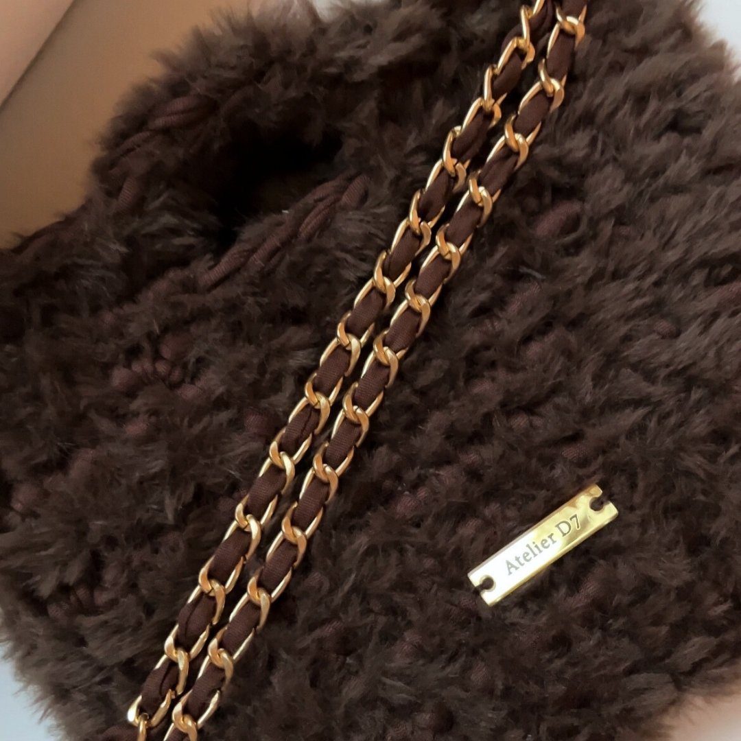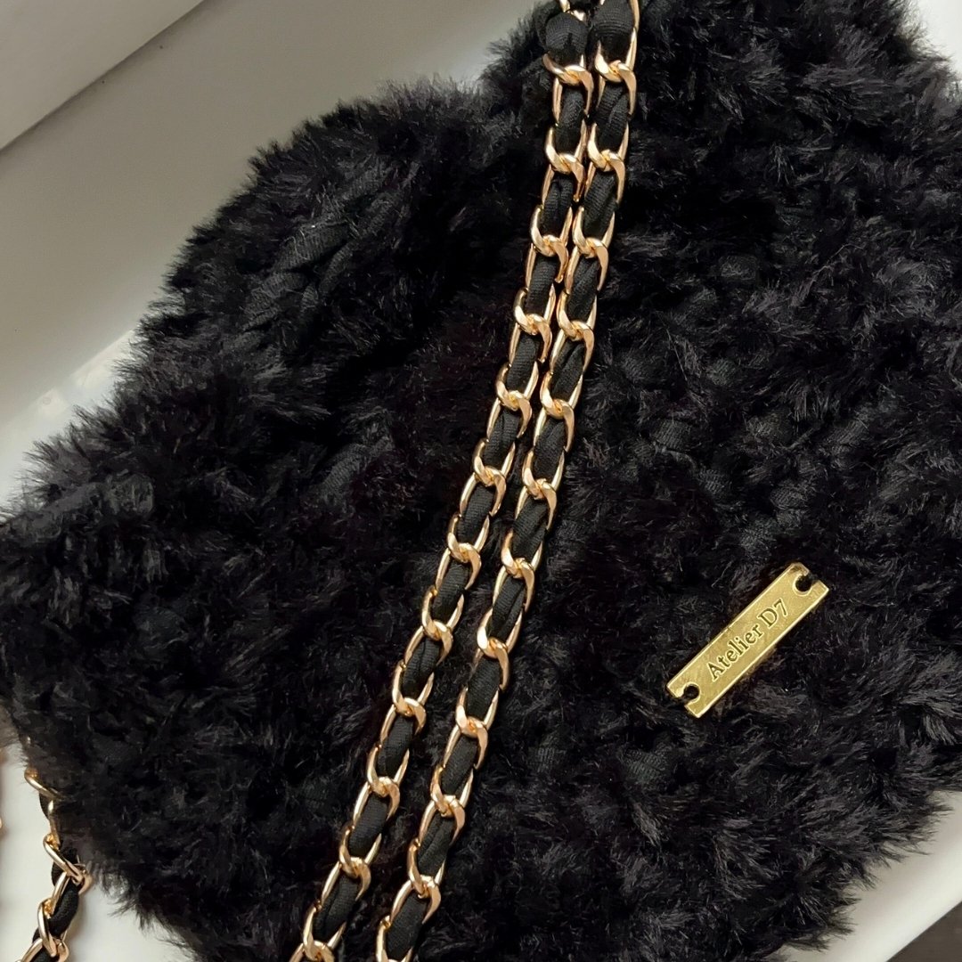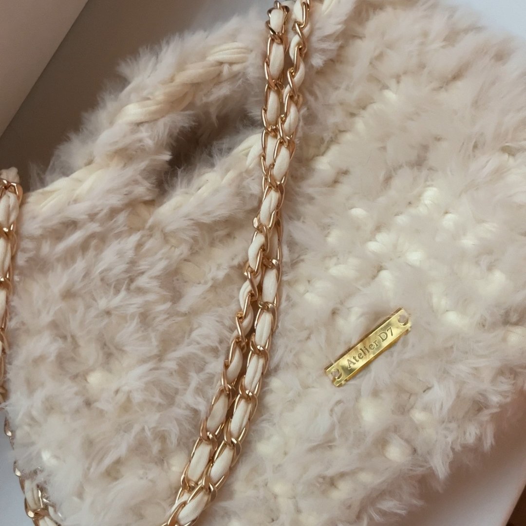 Kézzel készített, elegáns horgolt táska puha, szőrös fonalból. Letisztult forma, kézi fogóval és levehető 120 cm-es arany vagy ezüst lánc pánttal. Minden táska egyedi gondossággal készül, így nemcsak praktikus, hanem karakteres, kézműves értéket képviselő darab is. Elegáns arany vagy ezüst Atelier D7 logóval ellátva.